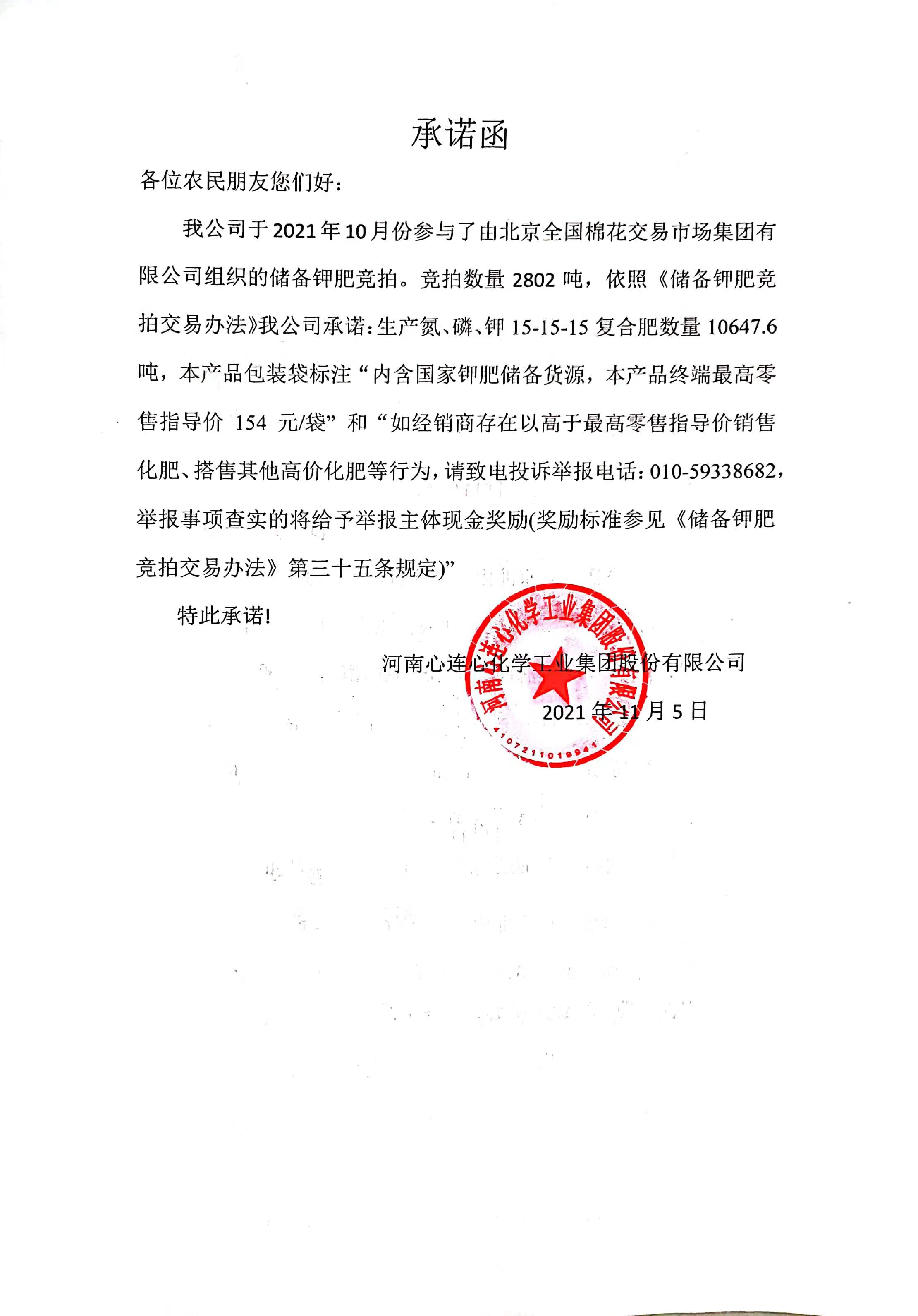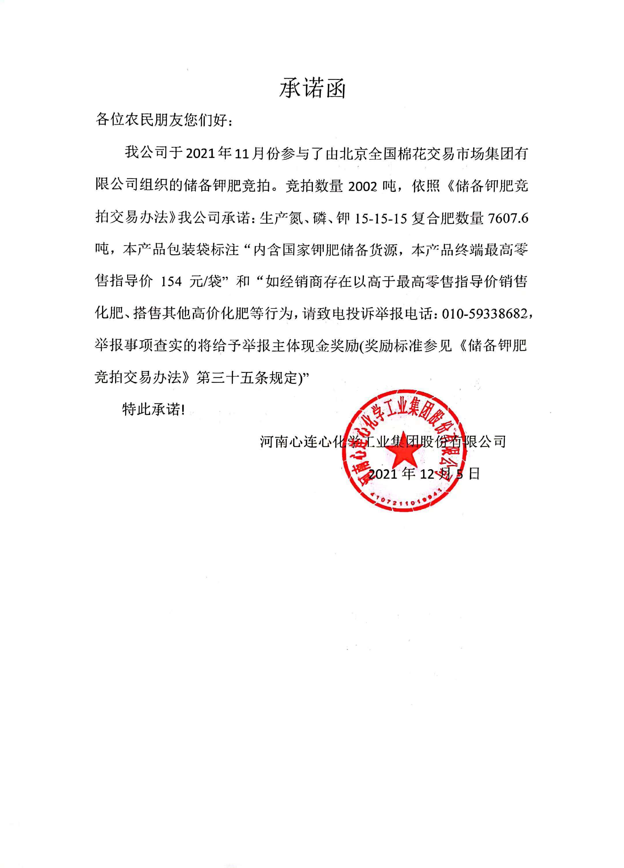 河南心連心化學(xué)工業(yè)集團股份有限公司分別于2021年10月、11月份參與了由北京全國棉花交易市場(chǎng)集團有限公司組織的儲備鉀肥競拍。依照《儲備鉀肥競拍交易辦法》公司做出以下承諾,詳見(jiàn)附件: